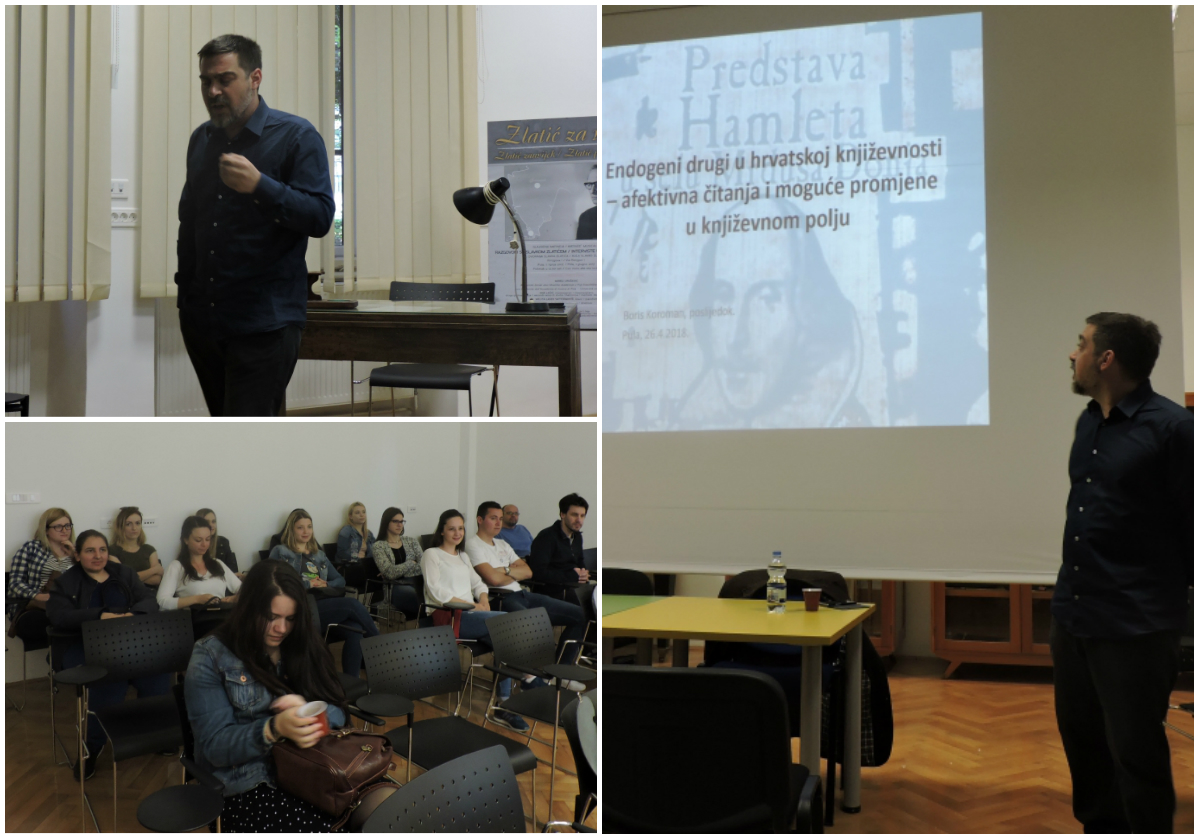 Travanjsko javno predavanje CKPIS-a pod naslovom Endogeni drugi u hrvatskoj književnosti – afektivna čitanja i moguće promjene u književnom polju održao je dr. sc. Boris Koroman, viši asistent u CKPIS-u i na Odsjeku za kroatistiku Filozofskog fakulteta u Puli. Predavanje je održano u četvrtak, 26. travnja 2018., u 18.00 sati u Dvorani Slavka Zlatića fakultetske zgrade u Ronjgovoj 1 (čitaonica, prizemlje). Bilo je riječi o predodžbi endogenog drugog u hrvatskoj književnosti 20. i 21. stoljeća. Glavno pitanje bilo je zašto u suvremenosti postoje snažni afekti u čitanjima Ante Tomića koji dovode i do nasilja, ili u čemu je i postoji li zapravo razlika u čitanju Ive Brešana s Predstavom Hamleta u Selu Mrduša Donja ili sa Svećenikovom djecom. Predavanje je nastojalo osvijetliti fenomen afektivnog odnosa prema dijelu suvremene produkcije, ali i podsjetiti kako je on i dio kulturnih politika dominantnih političkih opcija.