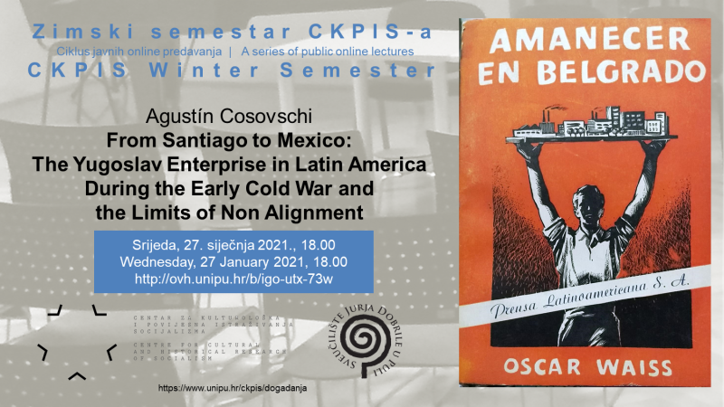 Posljednji predavač u Zimskom semestru CKPIS-a bit će Agustín Cosovschi, poslijedoktorand na projektu Dissinvent i gostujući predavač na Katoličkom sveučilištu u Lilleu i Sveučilištu u Parizu, koji se bavi političkom i intelektualnom poviješću Hladnog rata i jugoistočne Europe. Govorit će o jugoslavenskim nastojanjima za uspostavom tješnjih odnosa s latinoameričkim zemljama, posebno Čileom, i tamošnjim lijevo orijentiranim organizacijama tijekom 1950-ih i 1960-ih. Politika nesvrstanosti Jugoslaviji je u tome bila i pomoć i smetnja. Predavanje će biti održano na engleskom jeziku u virtualnoj dvorani.
